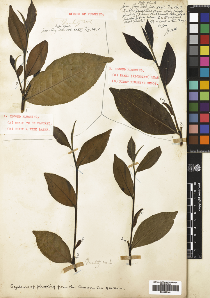 System of plucking from the Assam Co’s Garden, Sir George Watt. Collection of Royal Botanic Garden Edinburgh. George Watt’s tea specimens were used as part of his researches into tea as part of his role as an economic botanist in British India.