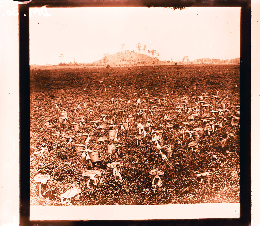 Coolies plucking, tea plantation, Darjeeling, 1880. George Watt slides, from the collection of Royal Botanic Garden, Edinburgh.