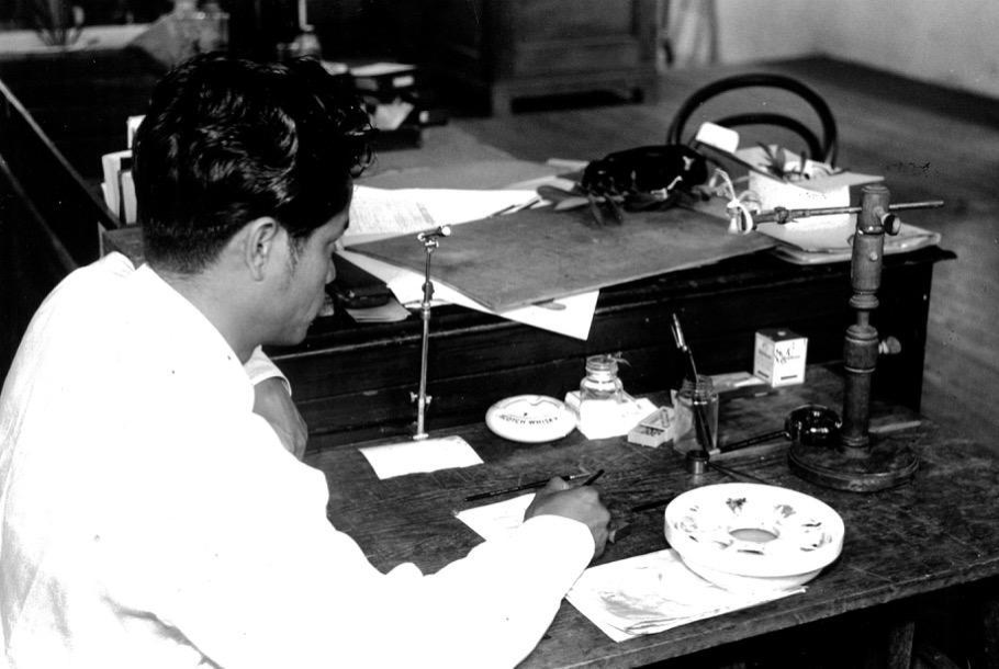 Figure 3. Juraimi bin Samsuri at work in the herbarium of the Singapore Botanic Gardens in 1959. Photographer unknown. Collection of Singapore Botanic Gardens.