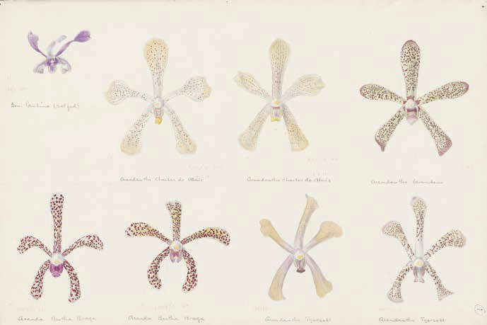 Figure 1. Juraimi bin Samsuri, undated. Watercolour painting of orchids hybrids of Dendrobium and Aranda. Juraimi bin Samsuri painted orchids extensively to document the colour and morphology of species as well as hybrids developed in the nurseries and laboratoro of the Singapore Botanic Gardens. Collection of Singapore Botanic Gardens.